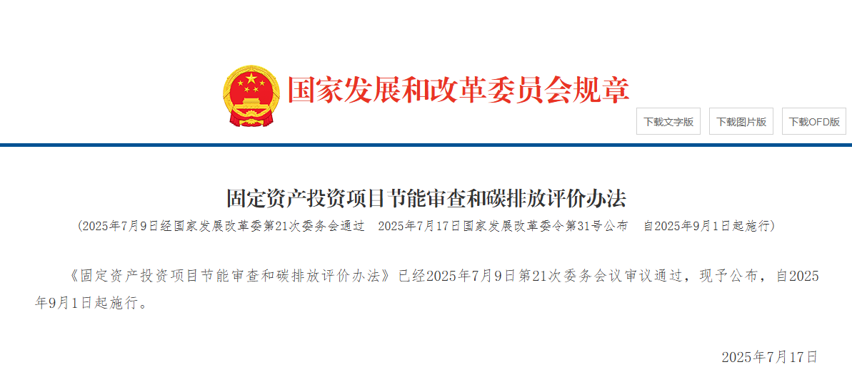节能审查是指根据节能法律法规、政策标准等,对固定资产投资项目能源消费、能效水平及节能措施等情况进行审查,并形成审查意见的行为。《中华人民共和国节约能源法》规定,国家实行固定资产投资项目节能评估和审查制度。2010年,国家发展改革委出台《固定资产投资项目节能评估和审查暂行办法》,并分别于2016年和2023年两次对办法作了修订,进一步优化制度设计、提升审查效能。节能审查制度建立实施以来,在提高能源利用效率、促进产业提质升级等方面发挥了重要作用,有力推动经济社会高质量发展。为进一步适应新形势、新任务和新要求,更好指导有关方面做好节能审查和碳排放评价工作,国家发展改革委修订印发《固定资产投资项目节能审查和碳排放评价办法》(国家发展和改革委员会令2025年第31号),自2025年9月1日起施行,原《固定资产投资项目节能审查办法》(国家发展和改革委员会令2023年第2号)同时废止。